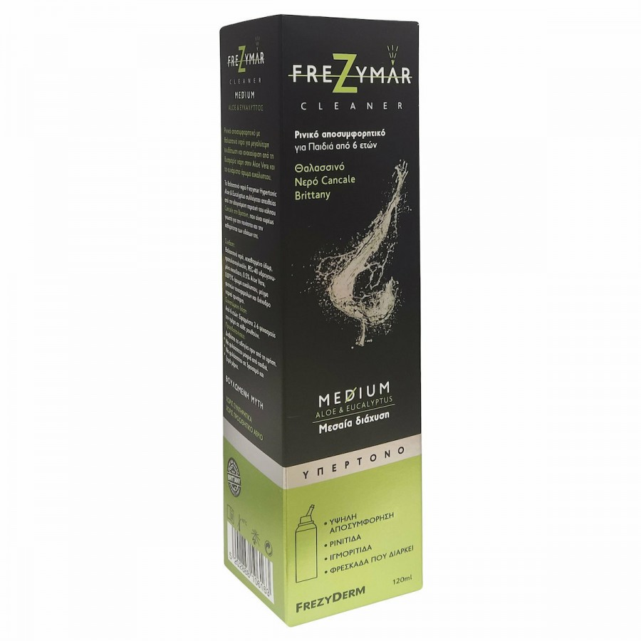 Το αποσυμφορητικό spray, Frezyderm Frezymar Medium Aloe & Eucalyptus Hypertonic περιέχει φυσικό θαλασσινό νερό υψηλής καθαρότητας, από τις ακτές της Γαλλικής Βρετάνης, το οποίο αποτελείται από μεταλλικά άλατα και ιχνοστοιχεία, κατάλληλα για την αντιμετώπιση της ρινικής συμφόρησης.