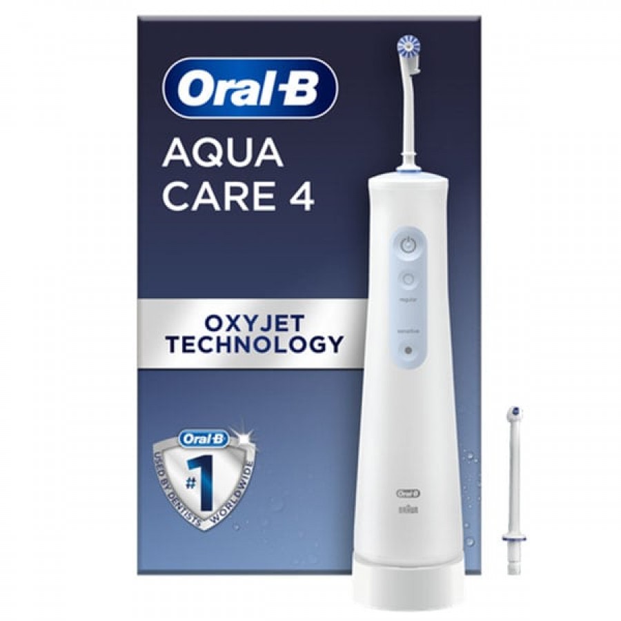 Ενισχύστε τις συνήθειες στοματικής φροντίδας σας με το εργαλείο water flosser Oral-B Aquacare για καθαρισμό ανάμεσα στα δόντια, με τεχνολογία Oxyjet για εξαιρετική φροντίδα των ούλων. Τεχνολογία Oxyjet: νερό εμπλουτισμένο με μικρο-φυσαλίδες που ενισχύουν την καθαριστική δράση Λειτουργία κατ απαίτηση: λειτουργία για ακριβή καθαρισμό 2 εντάσεις: προσαρμόστε τη λειτουργία καθαρισμού με κανονική ένταση πίεσης νερού ή πίεση νερού για ευαίσθητα δόντια 2 πίδακες: επιλέξτε τη στοχευμένη ή την περιστροφική ροή νερού Ασύρματο: εύκολος χειρισμός χωρίς εξαρτήματα